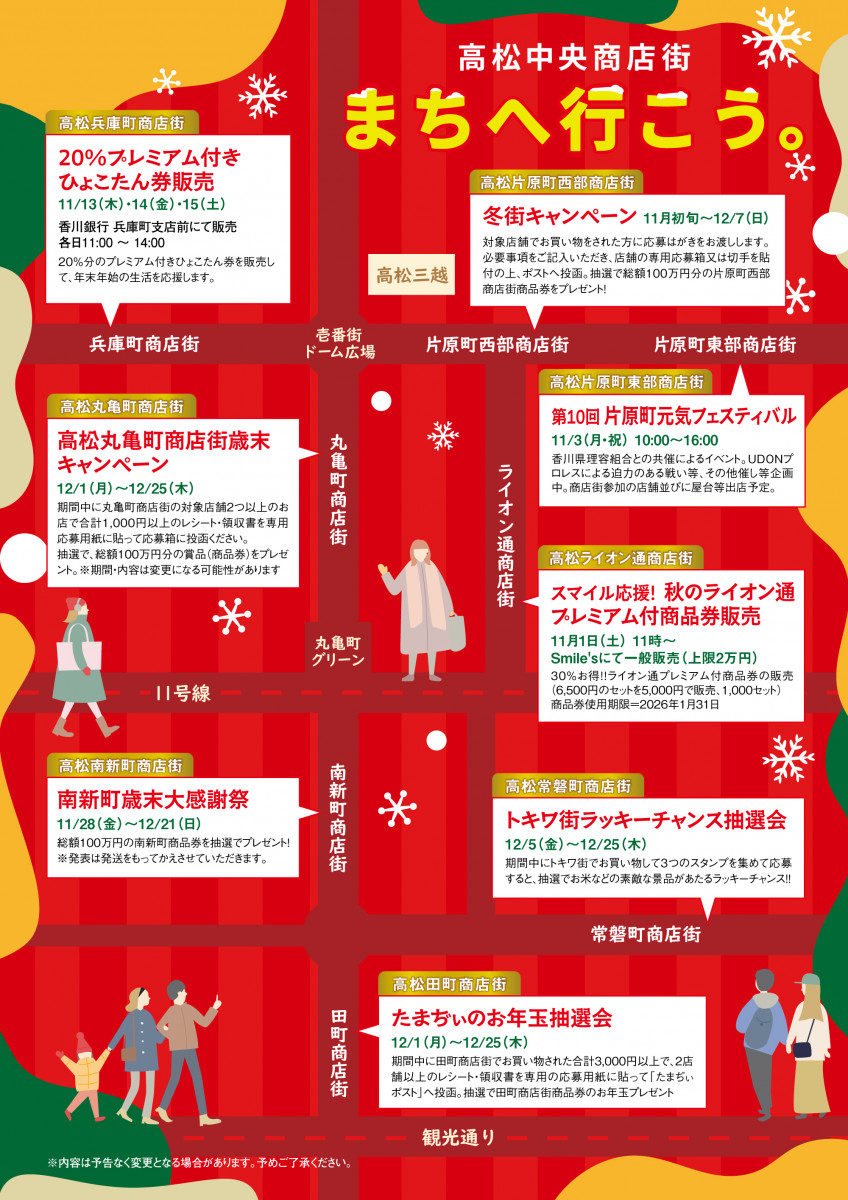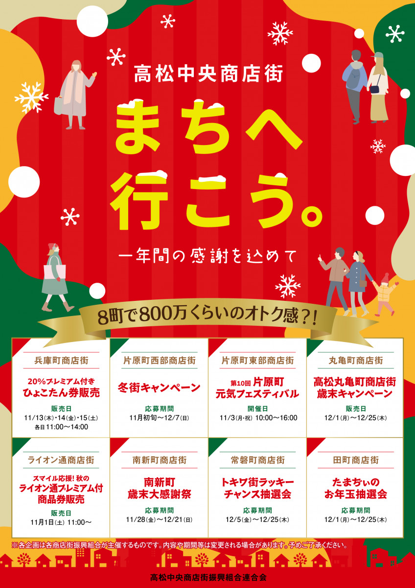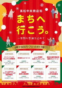高松中央商店街振興組合連合会では、一年間の感謝を込めて、各商店街のイベント情報をまとめた「8町連携チラシ」を作成しました。